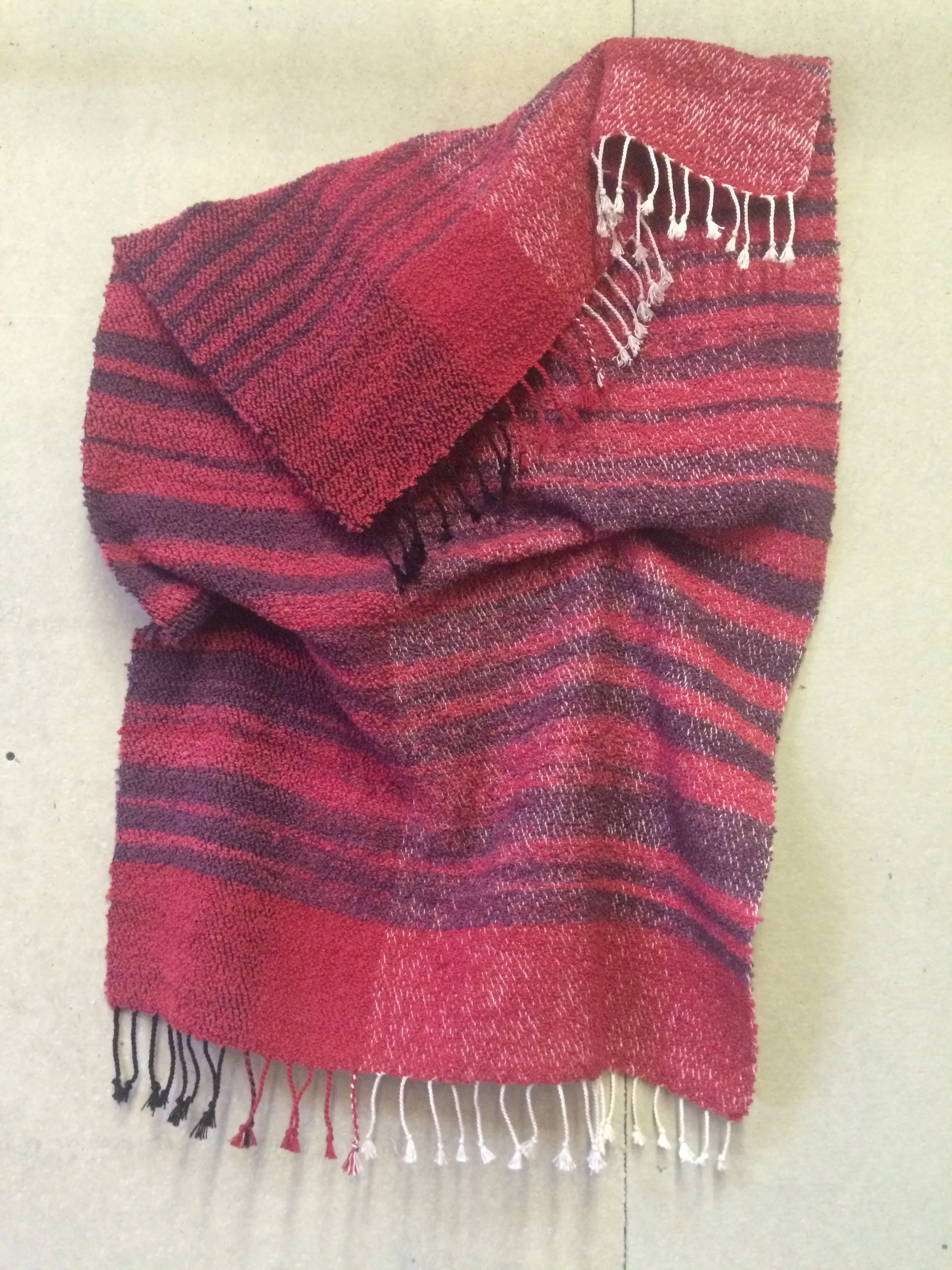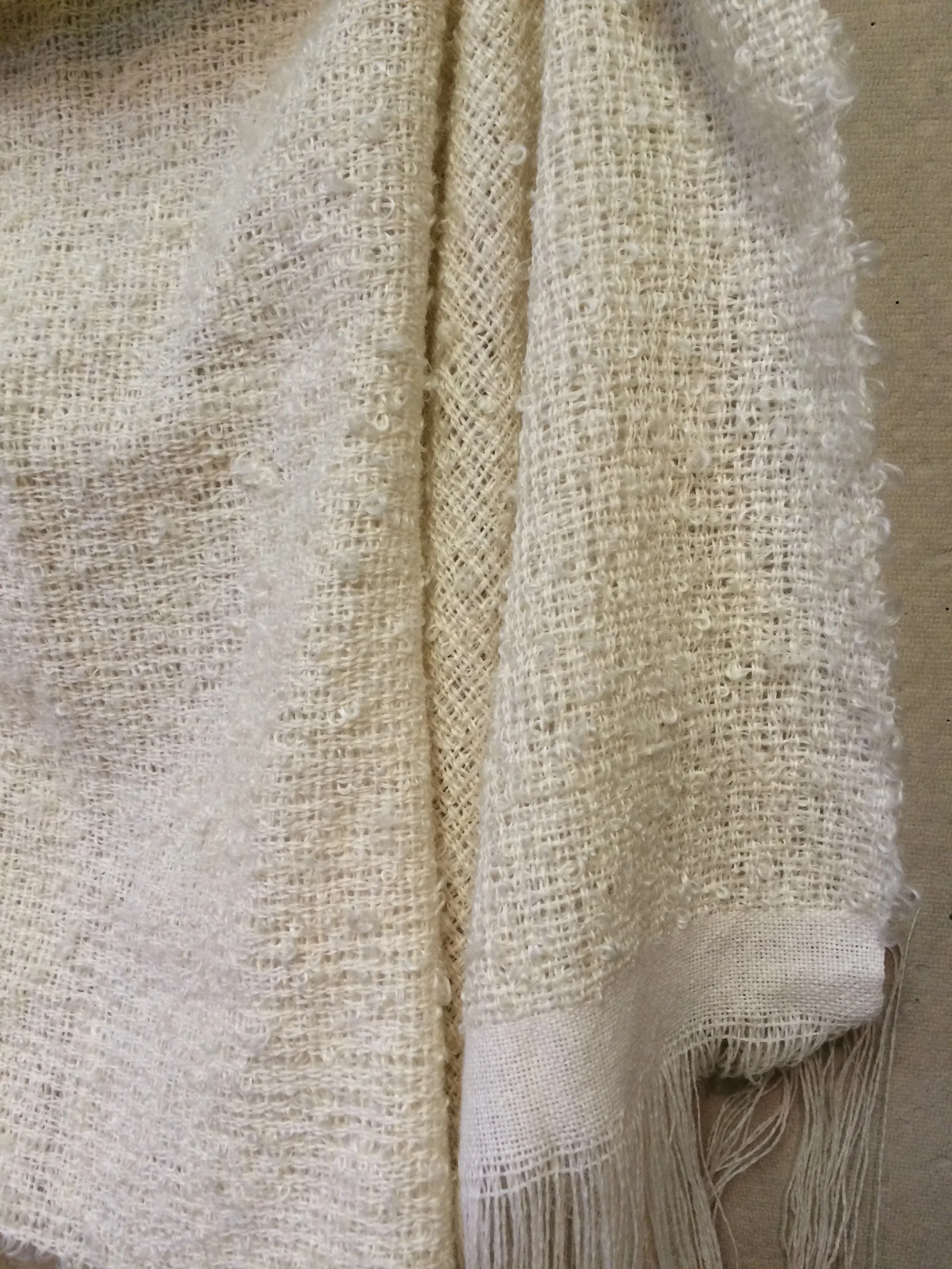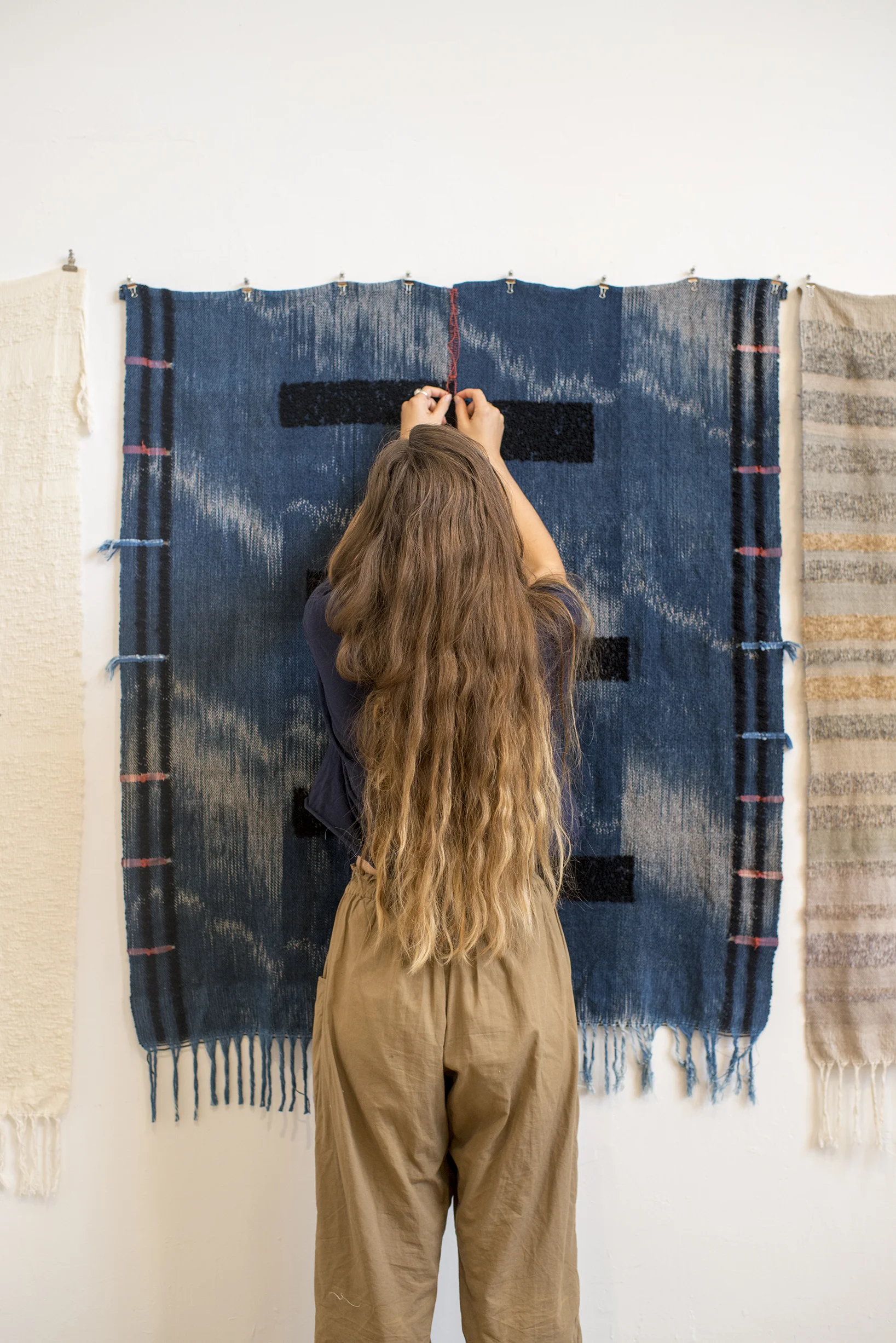 Based on my knowledge of the materials and my intuition about the final piece, most are colored with natural dyes, by boiling natural materials in water to extract their essential colors. Each panel is dyed separately and then gently washed by hand, so as to not disturb the wool by agitation, and then dried flat. Finally, I finish each piece by hand, stitching multiple panels together and either hemming or twisting fringes.